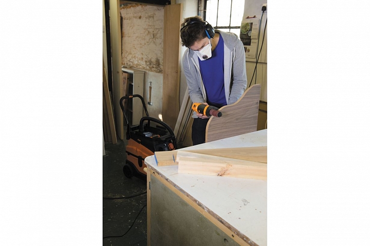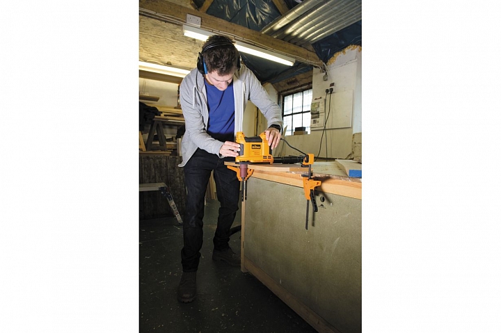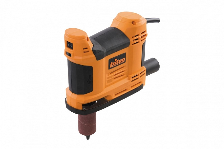 Triton TSPSP650 – уникальный инструмент, работающий по тому же принципу, что и осцилляционно-шпиндельные станки. Его основное назначение – шлифовка криволинейных кромок под прямым углом к плоскости заготовки. За счет осциллирующего движения улучшается качество шлифования (дефекты абразива не оставят продольных полос) и повышается ресурс расходных материалов (втулок). Последние выполнены быстросъемными и фиксируются на шпинделе единственным винтом с головкой под захват рукой. Их меняют не только в случае износа, но и в зависимости от степени кривизны кромки.